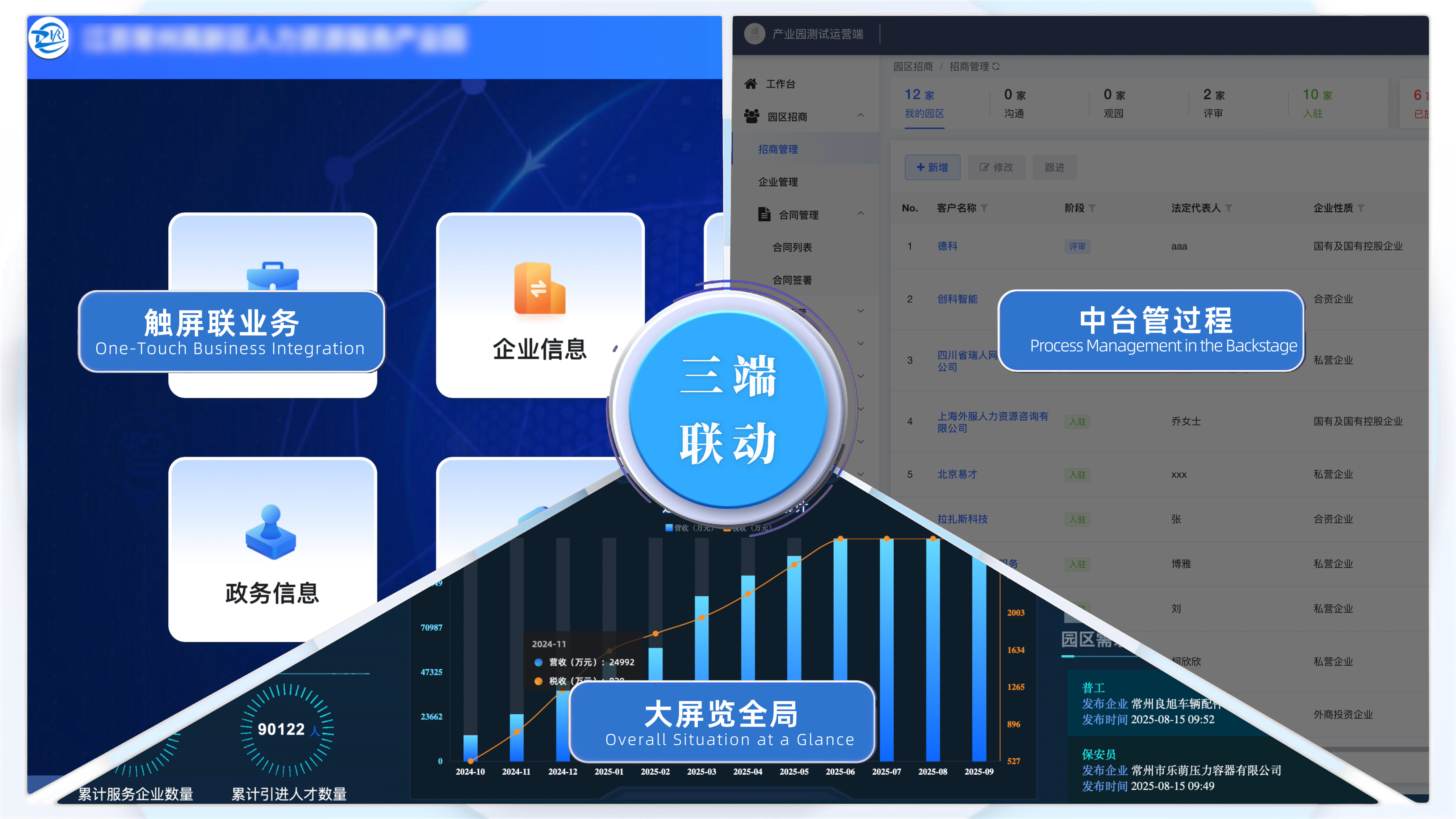 博尔捷作为国内首家市场化运营产业园的机构,基于50余个城市的园区规划经验,与跨越11省的27家园区的运营积淀,推出以“三屏三端”为核心架构的数字化人力资源产业园系统(以下简称“智慧园区系统”)。