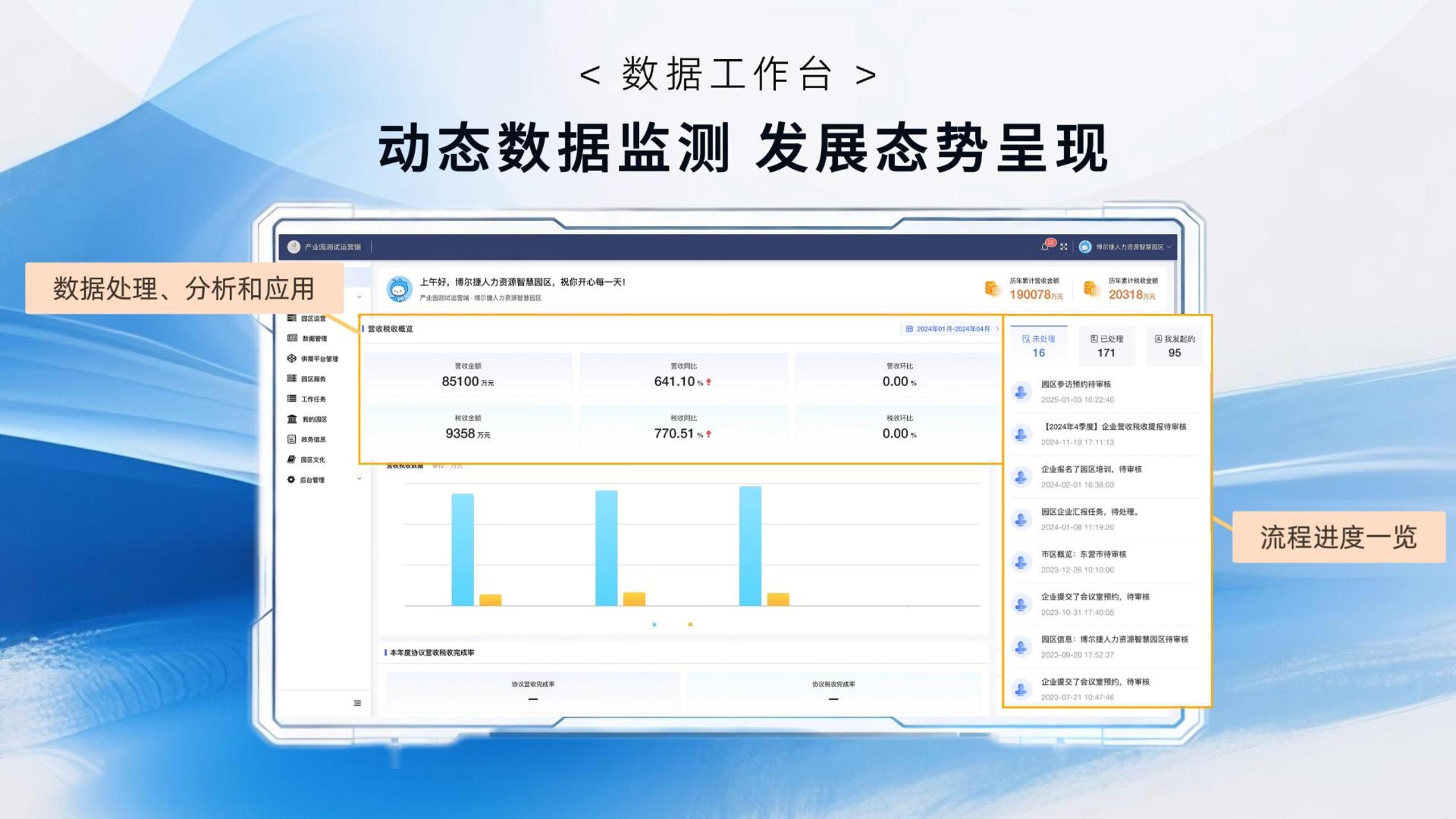 博尔捷智慧园区系统以数字化工具解决“真问题”,让政府管理有“数”可依,让机构经营有“道”可循,让企业合作有“据”可查,让园区运营有“序”可遵,致力构建起政策精准触达、服务高效匹配、需求快速响应的数字新生态。
