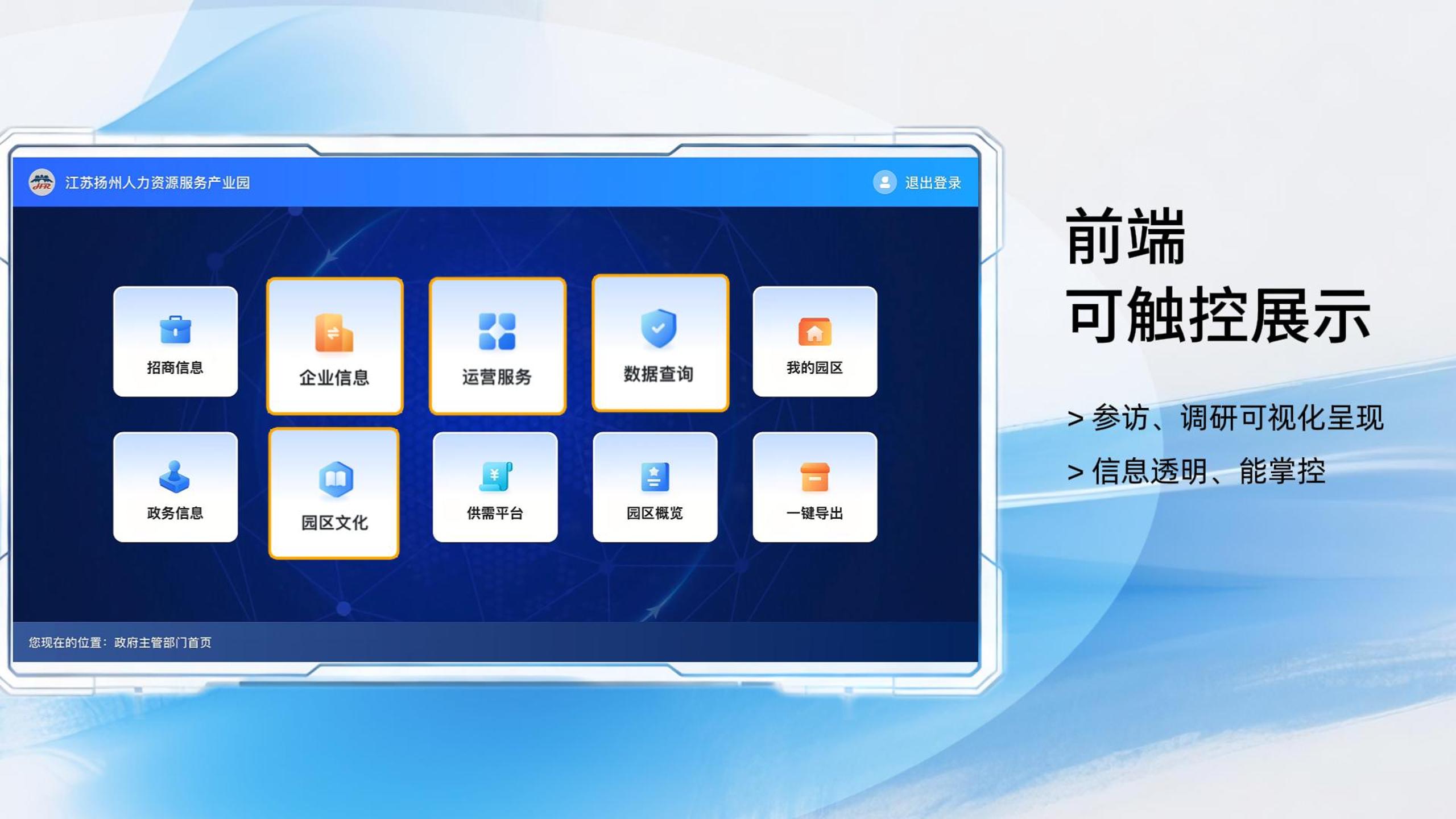 智慧园区系统通过触屏业务终端,服务从“线下对接”变为“指尖互联”,为四方主体提供便捷的业务对接平台,有效促进产业园生态的价值共创。